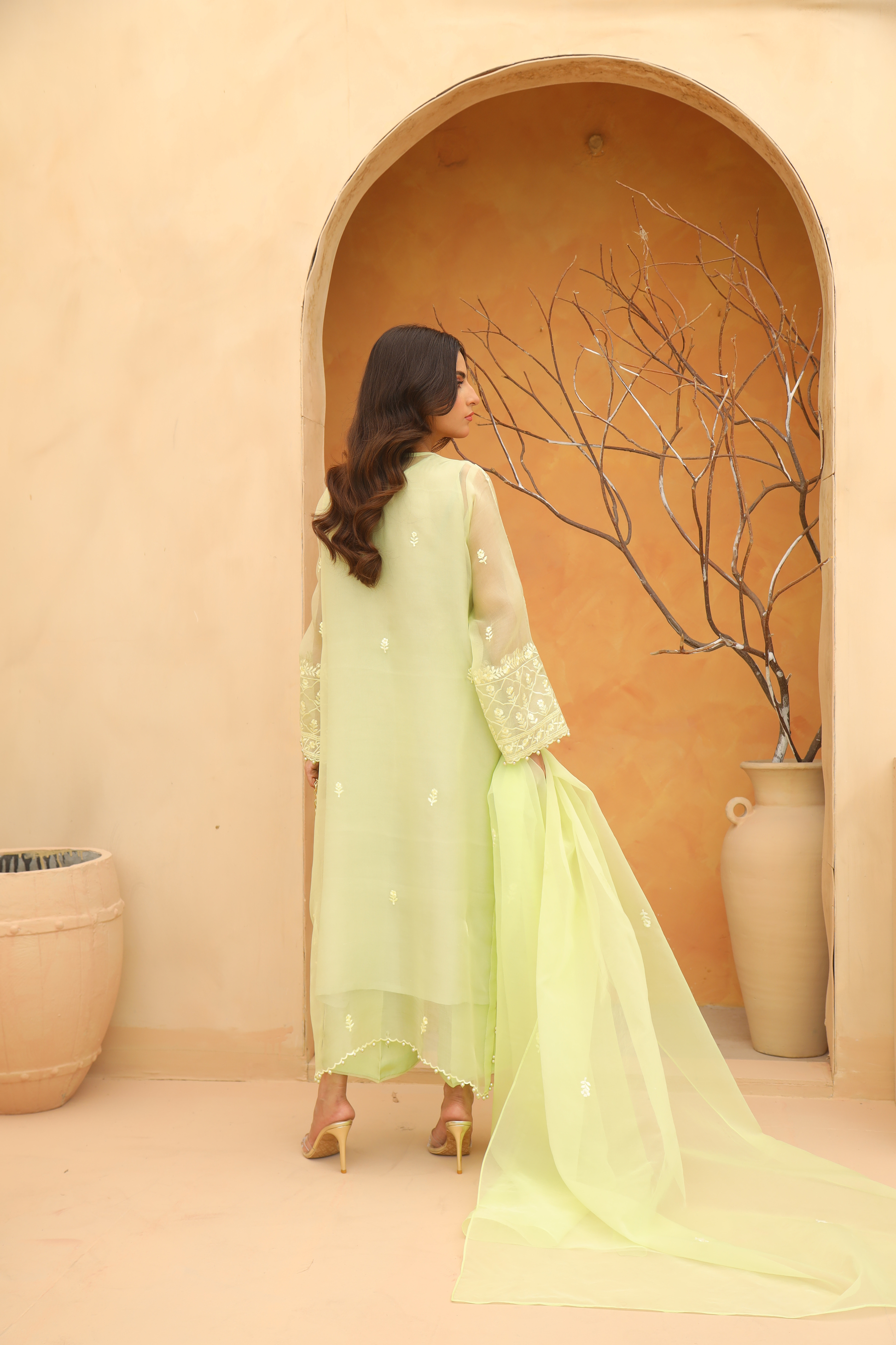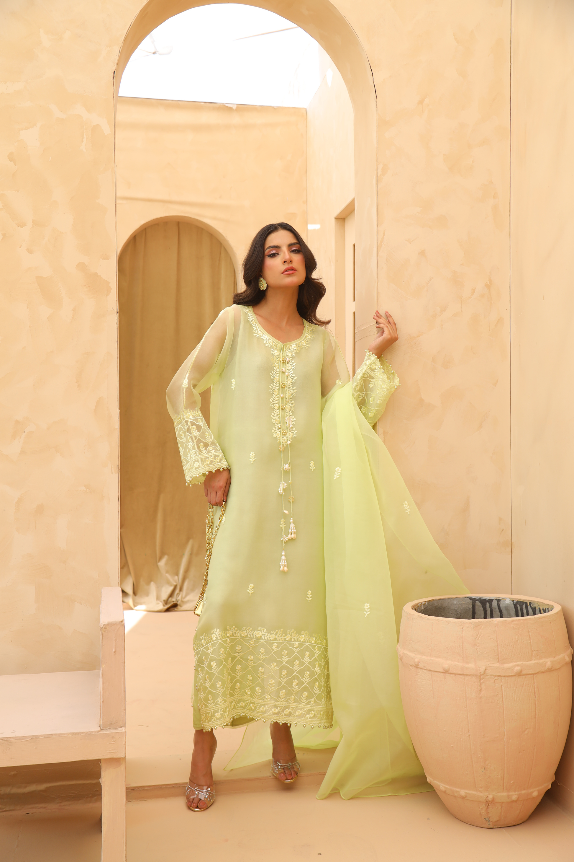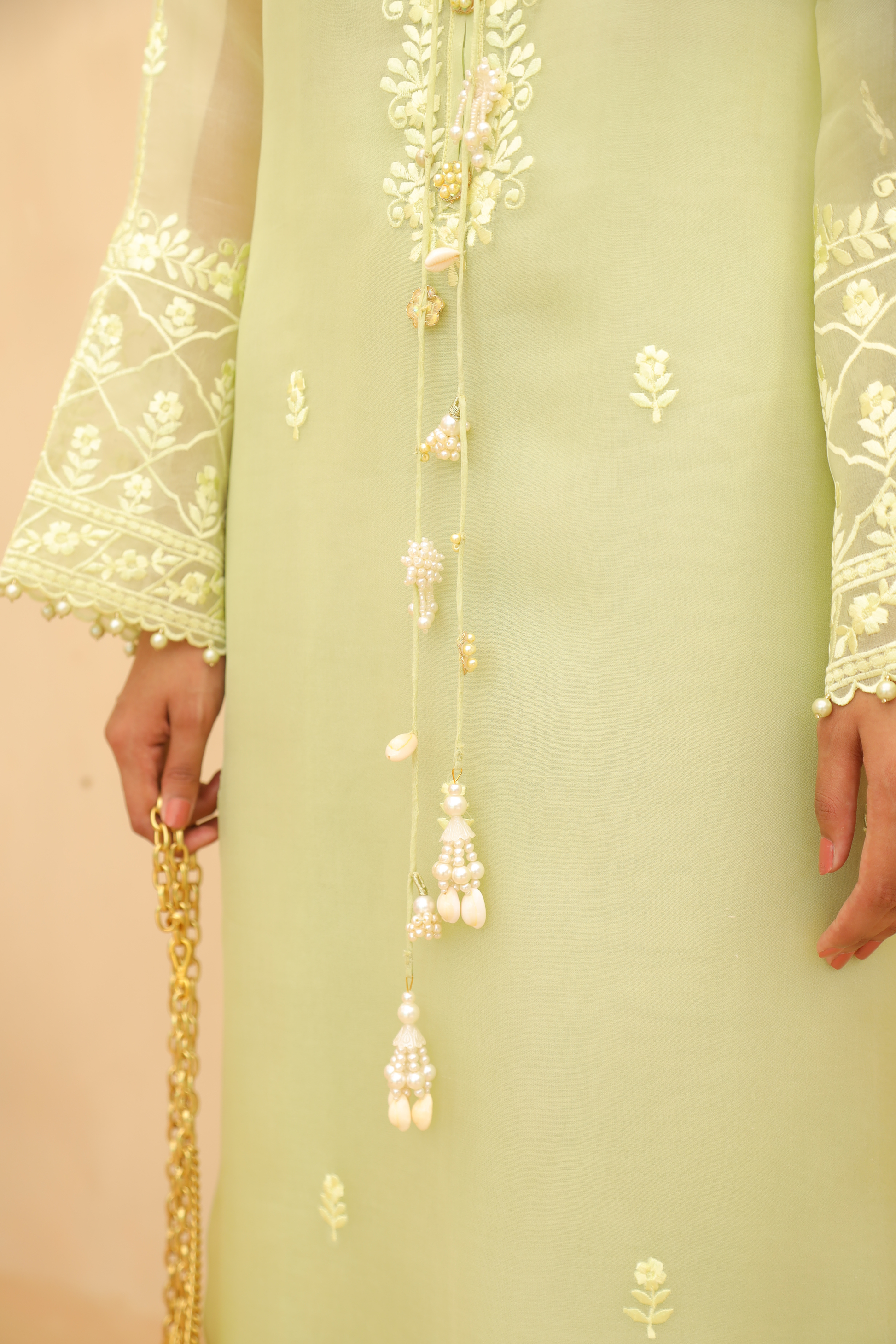 This mint green organza shirt and dupatta offers a refined and flattering silhouette. Beautiful machine embroidery details and delicate tassels are adding a soft and fashionable touch. Perfect for a mid day gathering.